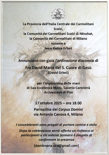 Tutta la nostra Provincia Carmelitana dell' Italia Centrale è lieta di annunciare l'Ordinazione Diaconale di f. David Maria del Sacro Cuore di Gesù per le mani di sua Eccellenza Mons. Saverio Cannistà, Arcivescovo di Pisa.