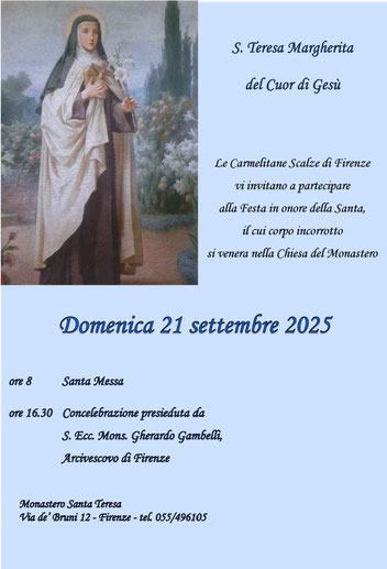 L'invito delle nostre monache Carmelitane Scalze di via dei Bruni a Firenze dove si trova il corpo incorrotto di S. Teresa Margherita per la concelebrazione Eucaristica di domenica 21 settembre