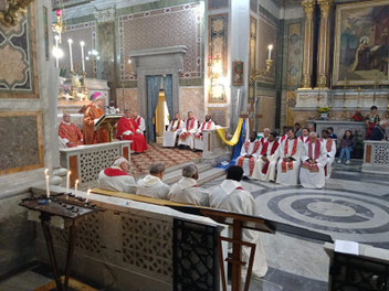 La nostra diocesi da settembre ha un nuovo vescovo (il precedente è andato in pensione), il suo nome è Santo Marcianò che ci ha onorato al Santuario Madonna del Carmine con la sua prima visita ufficiale. Ha partecipato alla processione dal piazzale della Madonna girando intorno al convento per poi aprire lui stesso la porta Santa, così siamo entrati tutti in chiesa. Abbiamo potuto ammirare la sua umanità e ci è sembrato di conoscerlo da sempre, tanto conosce e ammira i nostri Santi Carmelitani. Riguardo a questi ultimi ci ha invitati ad approfondire il loro studio comprando i loro scritti. Alla fine della Messa, prima della benedizione, il nostro P. Provinciale Gabriele ha annunciato la morte di P Agostino, per il quale avevamo pregato nelle intenzioni della messa.