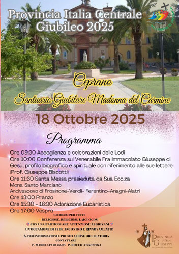 Ieri a Ceprano abbiamo avuto la giornata giubilare, con grande partecipazione O.C.D., O.C.D.S. ed altri amici. Il Professore Biscotti di Campobasso, grande storico, ha tenuto una conferenza su Fra' Immacolato, carmelitano di 51 anni immobile su un letto, con dolori e lacerazioni della pelle senza mai lamentarsi, ricostruendo tutto il percorso per la sua beatificazione.